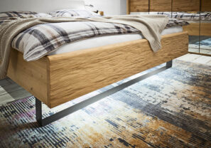 Komfortbett mit Holzkopfteil und Stollenfußteil.